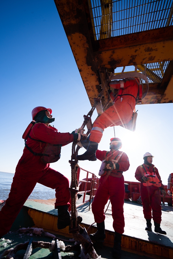 想要登上平臺并不簡單,需要船員幫忙扶住軟梯才能穩穩攀爬