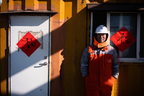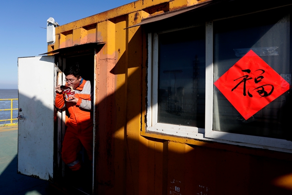2月3日,臘月二十九,微風(feng),少冰,這是年前最后一次看望“老友”了(le)。送他(ta)來的(de)拖輪遠去(qu),大海中(zhong)央的(de)WHPB平臺又恢復了(le)寧靜。規定動作之后,鄭旭一在工(gong)作間的(de)門上貼了(le)前一天寫好的(de)“福”字。作為一個地(di)道的(de)山東(dong)人(ren)(ren),他(ta)固執地(di)覺(jue)得(de),即使無(wu)人(ren)(ren)值守,也不能少了(le)年味(wei)兒。