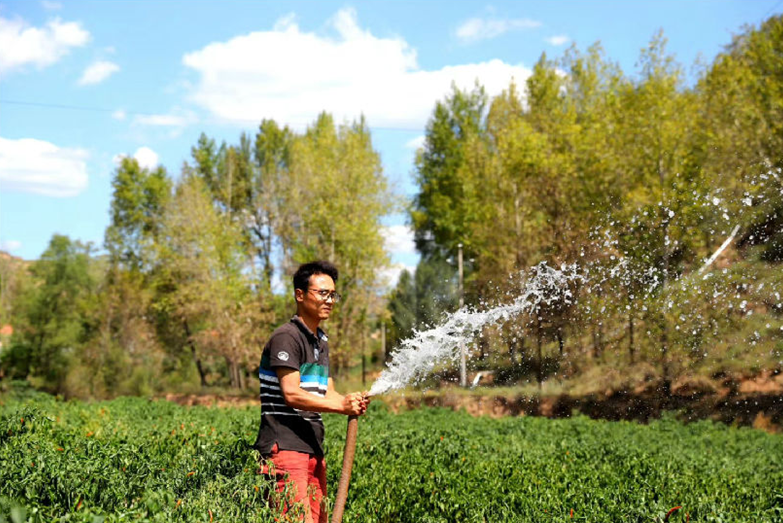 張磊在給貧困村民辣椒地澆水