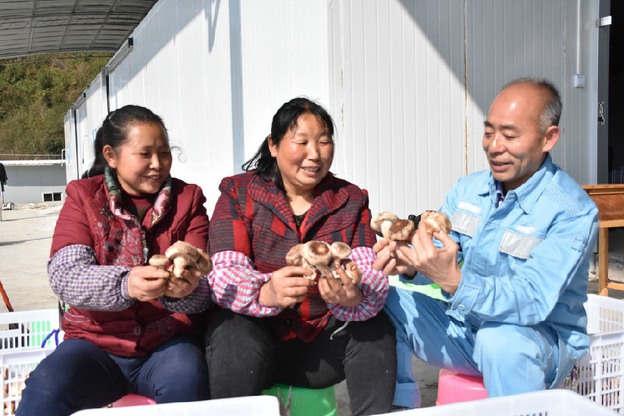 蘇遠清與村民們在食用菌基地大棚內采摘香菇。目前14個大棚里的20多萬根菌棒長勢喜人,農戶們搶抓時機,采摘香菇上市,以供應市場需求。