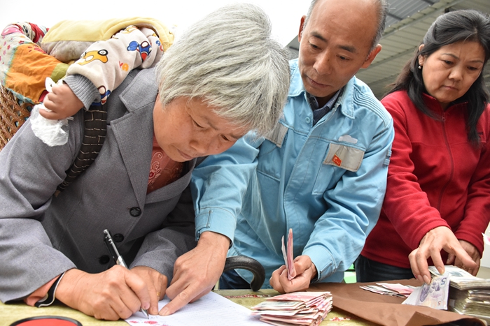 蘇遠清將食用菌第一期分紅發放給貧困戶。