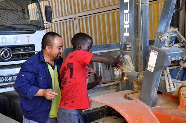 阿斯本在中籍師傅指導下維修叉車