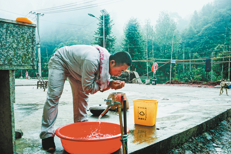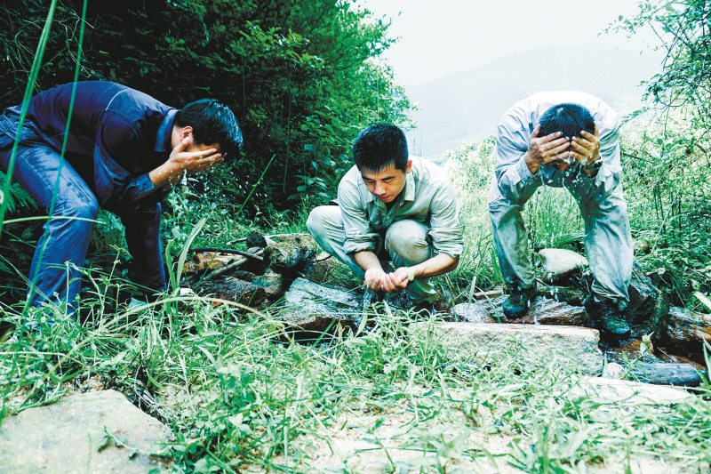 2019年8月9日,巡線途中累了,吳軍(右一)和同事捧起山間泉水洗臉,稍做休息再繼續前行。
