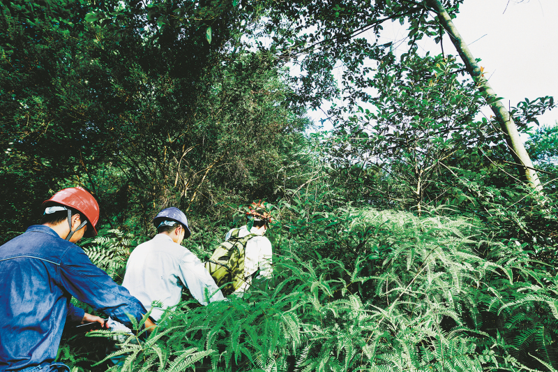 2019年8月9日,巡線人員帶著巡線設備和無人機,穿越雜草叢生的山路,徒步朝山頂的鐵塔走去。