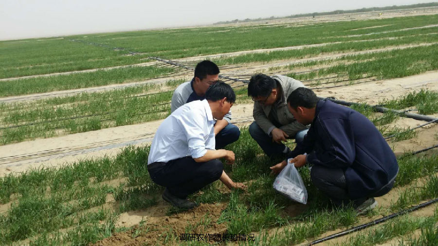 唐海峰(右二)現場研究滴灌時長與農作物長勢