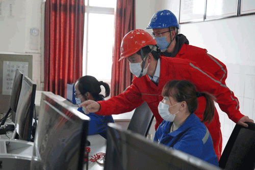 杜家紅(右二)和同事來到萬華生態家居有限公司為低壓設備維護提供技術支持