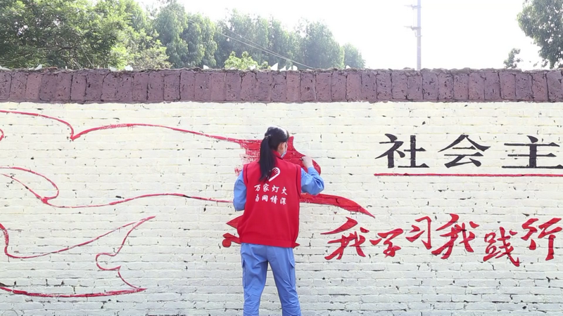 2020年4月15日,南方電網廣東湛江供電局團委開展“美麗鄉村 與榜樣同行”墻繪志愿活動,人大代表吳翔加入到志愿者行列,認真地為扶貧村公路邊上的墻繪制“社會主義核心價值觀”內容并上色。(陳其勛 攝)