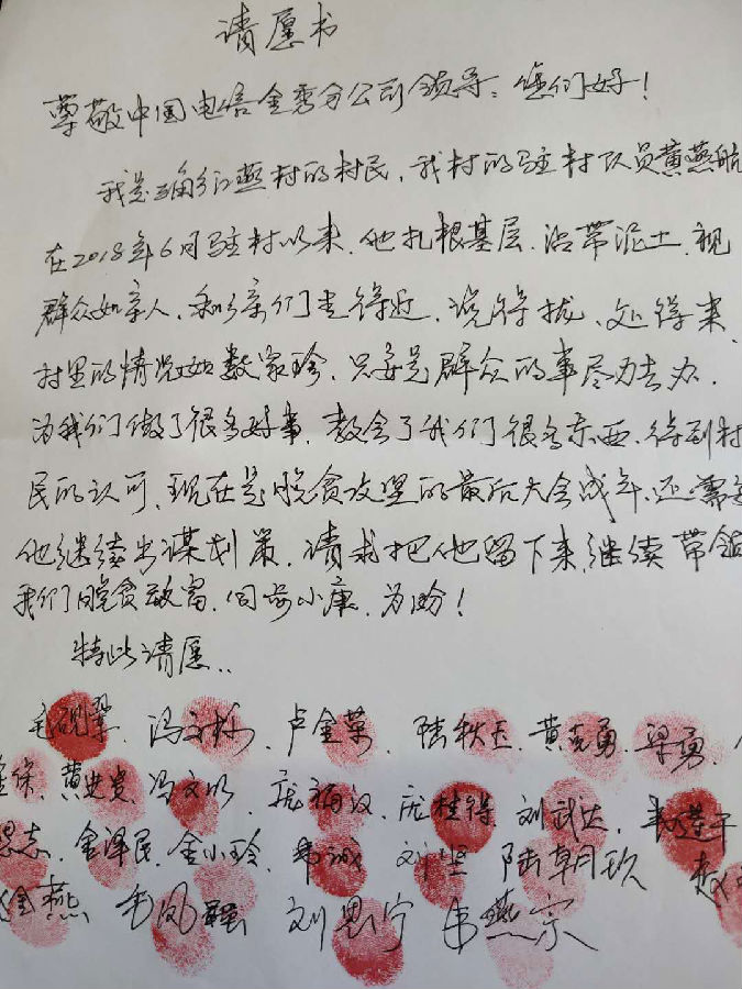 2020年4月9日,中(zhong)國(guo)電(dian)(dian)(dian)信(xin)廣西金秀分公(gong)司收到一封來自金秀縣三角鄉(xiang)江(jiang)(jiang)燕(yan)(yan)村村民(min)(min)的(de)請(qing)愿(yuan)書,請(qing)愿(yuan)書結尾(wei)是24位村民(min)(min)按有紅(hong)色手(shou)指印(yin)的(de)簽名。當江(jiang)(jiang)燕(yan)(yan)村村民(min)(min)得知電(dian)(dian)(dian)信(xin)公(gong)司擬對駐村扶(fu)(fu)貧(pin)隊(dui)員(yuan)(yuan)黃燕(yan)(yan)航(hang)(hang)進行調整的(de)消息,他們商討后決定(ding)給電(dian)(dian)(dian)信(xin)公(gong)司寫一封請(qing)愿(yuan)書將黃燕(yan)(yan)航(hang)(hang)留下來,繼續支持(chi)江(jiang)(jiang)燕(yan)(yan)村的(de)脫貧(pin)攻堅工作。這是一封對派駐江(jiang)(jiang)燕(yan)(yan)村駐村扶(fu)(fu)貧(pin)隊(dui)員(yuan)(yuan)黃燕(yan)(yan)航(hang)(hang)高(gao)度贊(zan)揚的(de)請(qing)愿(yuan)書,更是對中(zhong)國(guo)電(dian)(dian)(dian)信(xin)扶(fu)(fu)貧(pin)工作的(de)認可和肯(ken)定(ding)。