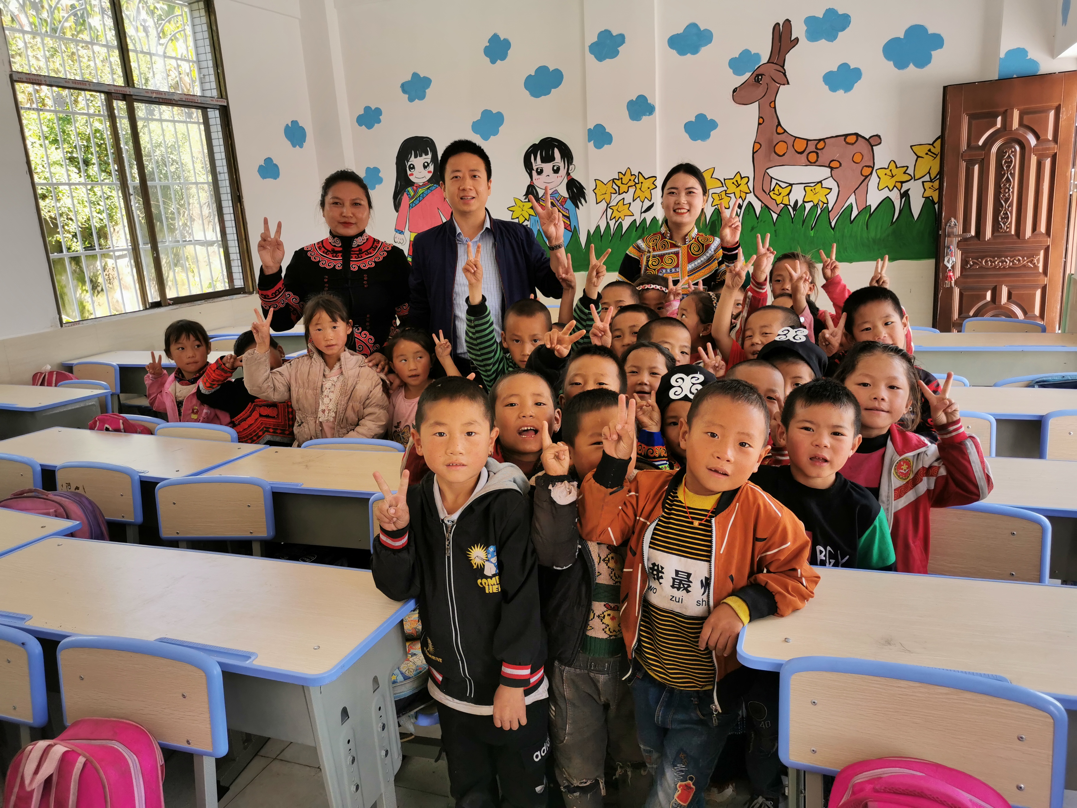 掛職普格縣政府辦公室副主任吳蔚與幫扶點學生在一起