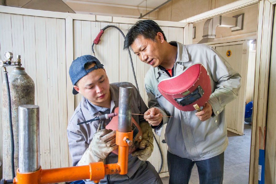 周海濤(右)正在對徒弟進行焊接技術指導