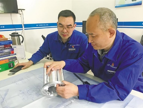 賈廣杰(右一)和同事在分析圖紙,研究零件加工工藝