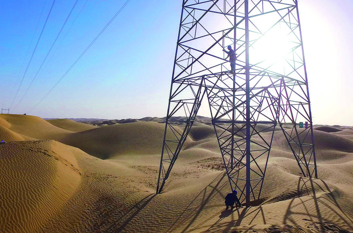 7月17日17時,新疆巴州供電公司輸電運檢五班班長艾合買提·托乎提和班員冒著42攝氏度高溫在塔克拉瑪干沙漠腹地巡視線路,并登塔擰緊松動的螺絲