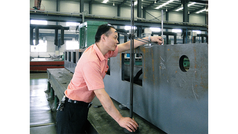 “呲(ci)……呲(ci)……”在國(guo)機(ji)(ji)集團(tuan)所(suo)屬恒天(tian)集團(tuan)常(chang)德紡織機(ji)(ji)械有限公司(以下(xia)簡(jian)稱(cheng)“常(chang)德紡機(ji)(ji)”)大(da)(da)件(jian)車間(jian),每天(tian)都會發(fa)出這(zhe)一(yi)陣陣金(jin)(jin)屬摩擦的(de)聲音。車間(jian)里,有兩塊(kuai)十幾(ji)平米的(de)大(da)(da)型平板(ban),平板(ban)一(yi)角擺放著各種給(gei)毛(mao)坯零(ling)件(jian)劃(hua)線(xian)用的(de)工(gong)、量具(ju)。鉗(qian)工(gong)技師(shi)韓昌勇熟(shu)練地(di)操弄著各種測量工(gong)具(ju),不(bu)停地(di)為各種型號的(de)毛(mao)坯零(ling)件(jian)劃(hua)上(shang)一(yi)道(dao)道(dao)泛著金(jin)(jin)屬白光的(de)“精準線(xian)”,為下(xia)道(dao)機(ji)(ji)加工(gong)程(cheng)序(xu)做(zuo)好前置準備。