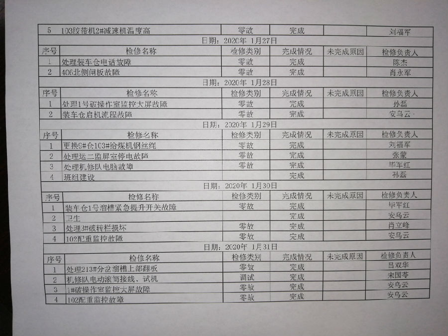 “1月30日,我繼續值班,裝車(che)倉1#溜槽(cao)緊急(ji)提升(sheng)開關故障(zhang),電修更換磁(ci)開關用時1.5小時。”