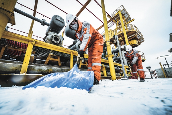 雪(xue)勢稍有(you)減弱,油田黨(dang)員就(jiu)紛紛帶頭上陣,清理甲(jia)板(ban)的暗冰與積雪(xue)。不一會兒(er),融化的雪(xue)水就(jiu)浸濕了(le)(le)他(ta)們的工(gong)服(fu)。累(lei)了(le)(le),他(ta)們便輪(lun)替休(xiu)息,用暖風槍烘烘衣服(fu),緩(huan)過勁兒(er)來(lai)接(jie)著干(gan)。