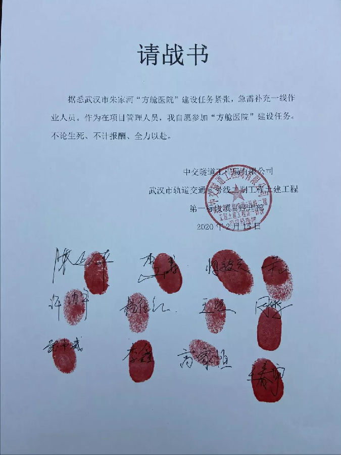 80后(hou)項目經理、黨員(yuan)陳(chen)延平立即召開全體人(ren)員(yuan)會議,“特(te)殊時期(qi),大家已(yi)連續奮(fen)戰多天,但‘前(qian)線(xian)’急(ji)需支援,項目成(cheng)立青年(nian)突(tu)擊(ji)隊(dui),自愿(yuan)報(bao)名(ming),我是黨員(yuan),我報(bao)名(ming)。”“我是黨員(yuan),我先上!”青年(nian)黨員(yuan)王春(chun)宇第一個(ge)請(qing)戰,不(bu)到5分鐘,由12名(ming)平均年(nian)齡不(bu)到30歲青年(nian)人(ren)組成(cheng)的突(tu)擊(ji)隊(dui)組建完成(cheng)。出征前(qian),突(tu)擊(ji)隊(dui)員(yuan)立下《請(qing)戰書》:我自愿(yuan)參加(jia)“方艙醫(yi)院”建設任務,不(bu)論(lun)生死(si),不(bu)計(ji)報(bao)酬(chou)、全力(li)以赴,請(qing)戰書上12個(ge)親(qin)筆簽名(ming)和鮮紅(hong)指印(yin),見(jian)證著隊(dui)員(yuan)們的青春(chun)擔當和必勝決心(xin)。