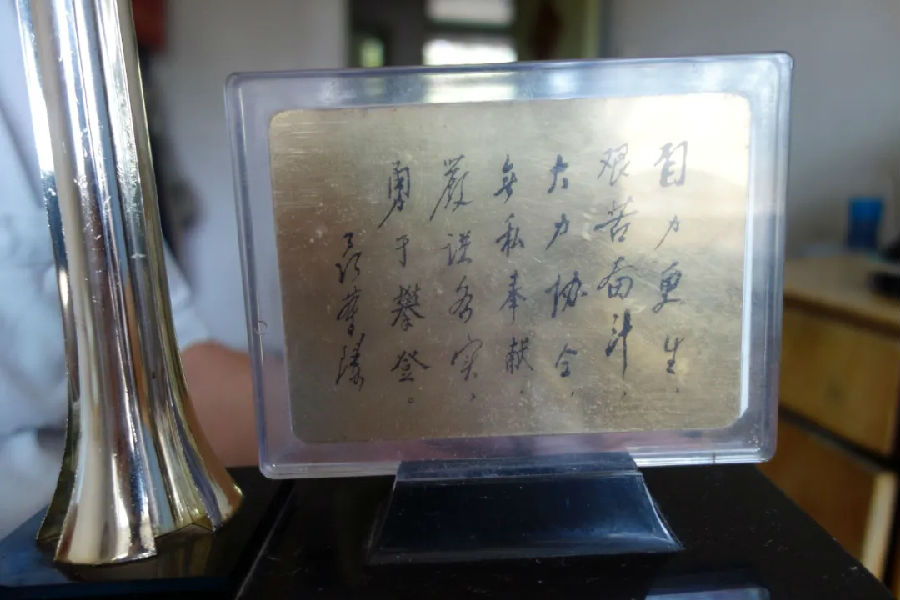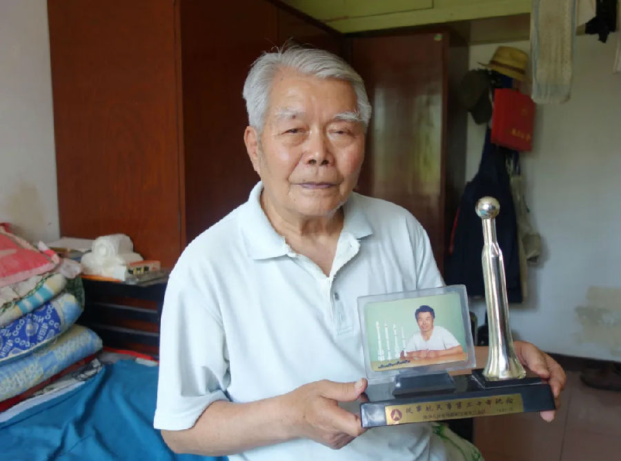 劉振財展示自己獲得的從事航天事業三十年紀念品,該紀念品由航空航天工業部于1991年頒發。劉淮宇 攝