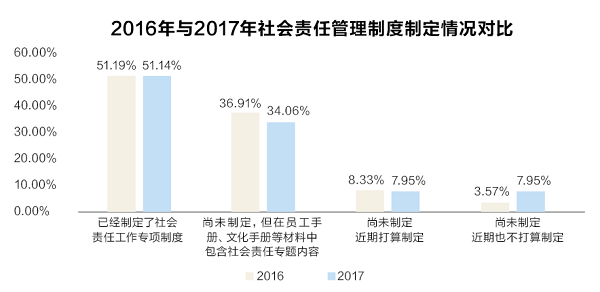 82%的中央企業確立企業社會責任理念。84%的中央企業立足自身業務特色識別出需要關注的社會環境問題。88%的中央企業確立社會責任主管部門。85%的中央企業制定了社會責任相關制度。61%的中央企業將社會責任工作納入工作績效考核。