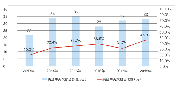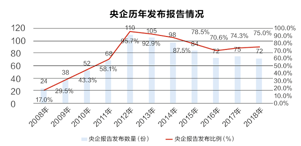 2018年,中央企業發布72份社會責任報告,發布比例與去年持平。38%的央企連續10年發布報告。央企英文版報告的比例提升了14%,國際化程度較高。