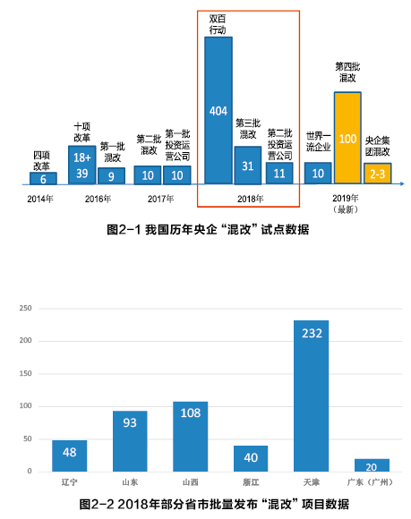 首先(xian),由“政(zheng)策(ce)”向(xiang)“行(xing)(xing)(xing)動(dong)(dong)(dong)(dong)”轉變(bian)。自十(shi)八屆(jie)三(san)中(zhong)全會明(ming)確國(guo)(guo)企(qi)(qi)深化改(gai)(gai)(gai)革(ge)(ge)(ge)指(zhi)導思想以(yi)來(lai),中(zhong)央陸續出臺(tai)頒布(bu)了(le)以(yi)《關于(yu)深化國(guo)(guo)有企(qi)(qi)業改(gai)(gai)(gai)革(ge)(ge)(ge)的(de)(de)指(zhi)導意見(jian)》(中(zhong)發(fa)【2015】22號)為(wei)“1”的(de)(de)國(guo)(guo)企(qi)(qi)改(gai)(gai)(gai)革(ge)(ge)(ge)頂層政(zheng)策(ce)體(ti)系(xi)(xi),政(zheng)策(ce)主(zhu)要覆蓋國(guo)(guo)企(qi)(qi)“混(hun)(hun)改(gai)(gai)(gai)”、國(guo)(guo)企(qi)(qi)法人(ren)治理、國(guo)(guo)企(qi)(qi)員工中(zhong)長期激勵、國(guo)(guo)有產權交易、國(guo)(guo)有資本(ben)監督、國(guo)(guo)有資本(ben)投資/運營等各(ge)個方(fang)面(mian),國(guo)(guo)企(qi)(qi)改(gai)(gai)(gai)革(ge)(ge)(ge)政(zheng)策(ce)體(ti)系(xi)(xi)基本(ben)完備。而在(zai)中(zhong)央“1+N”政(zheng)策(ce)體(ti)系(xi)(xi)下(xia),各(ge)地(di)(di)方(fang)政(zheng)府及國(guo)(guo)資系(xi)(xi)統結(jie)合各(ge)地(di)(di)實際情況,進一步配套細(xi)化了(le)針對(dui)本(ben)地(di)(di)的(de)(de)相關改(gai)(gai)(gai)革(ge)(ge)(ge)政(zheng)策(ce)和要求。現(xian)有中(zhong)央及地(di)(di)方(fang)國(guo)(guo)企(qi)(qi)改(gai)(gai)(gai)革(ge)(ge)(ge)政(zheng)策(ce)體(ti)系(xi)(xi)已然(ran)滿足指(zhi)導大幅改(gai)(gai)(gai)革(ge)(ge)(ge)“行(xing)(xing)(xing)動(dong)(dong)(dong)(dong)”的(de)(de)要求,改(gai)(gai)(gai)革(ge)(ge)(ge)關鍵在(zai)于(yu)如何改(gai)(gai)(gai)革(ge)(ge)(ge)、改(gai)(gai)(gai)革(ge)(ge)(ge)進度,以(yi)及改(gai)(gai)(gai)革(ge)(ge)(ge)效果的(de)(de)問題(ti)。2018年發(fa)生的(de)(de)“混(hun)(hun)改(gai)(gai)(gai)”試點、雙百(bai)行(xing)(xing)(xing)動(dong)(dong)(dong)(dong)、“混(hun)(hun)改(gai)(gai)(gai)”項目等為(wei)主(zhu)的(de)(de)“混(hun)(hun)改(gai)(gai)(gai)”行(xing)(xing)(xing)動(dong)(dong)(dong)(dong)數據,進一步印證了(le)國(guo)(guo)企(qi)(qi)“混(hun)(hun)改(gai)(gai)(gai)”已由“政(zheng)策(ce)”向(xiang)“行(xing)(xing)(xing)動(dong)(dong)(dong)(dong)”轉變(bian)。