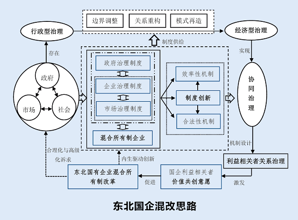 解(jie)決(jue)問題(ti)的(de)關(guan)鍵是以混合(he)所有制(zhi)(zhi)(zhi)改(gai)革為切入點,以制(zhi)(zhi)(zhi)度創(chuang)新為突破口(kou),從(cong)總體上把握東北國企(qi)制(zhi)(zhi)(zhi)度變(bian)遷的(de)“轉軌(gui)特征”和“演進軌(gui)跡”,通過政府治(zhi)理(li)(li)、市場治(zhi)理(li)(li)與社會治(zhi)理(li)(li)三個層(ceng)面的(de)“制(zhi)(zhi)(zhi)度創(chuang)新”來建構(gou)有助于“國企(qi)邊界(jie)調整(zheng)”、“利益相(xiang)關(guan)者(zhe)關(guan)系重(zhong)構(gou)”與“治(zhi)理(li)(li)模式再造”的(de)治(zhi)理(li)(li)機制(zhi)(zhi)(zhi),激活“利益相(xiang)關(guan)者(zhe)價值共創(chuang)意愿”,推動國企(qi)由(you)“行政型(xing)治(zhi)理(li)(li)”向“經濟型(xing)治(zhi)理(li)(li)”轉型(xing),具體思路如(ru)圖(tu)所示。