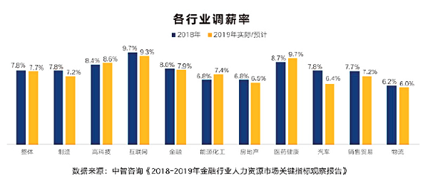 2018年(nian)(nian)全行(xing)(xing)業(ye)(ye)整體(ti)調(diao)薪(xin)率為7.8%,2019年(nian)(nian)預計(ji)為7.7%。從不同行(xing)(xing)業(ye)(ye)來看,除高(gao)(gao)科技、能源化工、醫藥健康行(xing)(xing)業(ye)(ye)2019年(nian)(nian)調(diao)薪(xin)率高(gao)(gao)于(yu)2018年(nian)(nian)外,其(qi)他行(xing)(xing)業(ye)(ye)均有所下降。互聯網行(xing)(xing)業(ye)(ye)2019年(nian)(nian)預計(ji)調(diao)薪(xin)率為9.3%,相(xiang)比2018年(nian)(nian)有所下降,但調(diao)薪(xin)率仍居各(ge)行(xing)(xing)業(ye)(ye)首位。