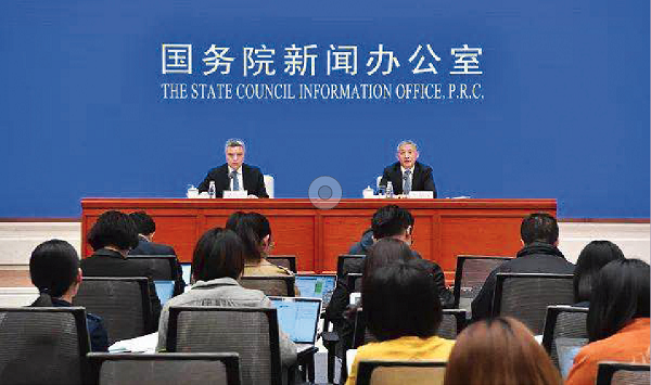 4月16日,國資委在國務院新聞辦舉行新聞發布會,國資委秘書長、新聞發言人彭華崗(右)通報2019年一季度中央企業經濟運行情況。