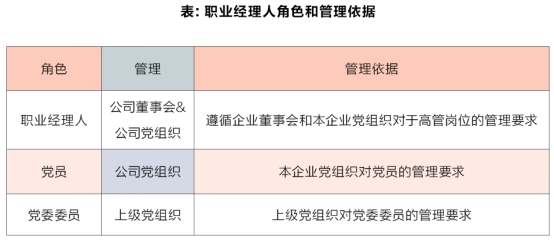 職業經理人的管理和組織任命干部管理要求存在差異:職業經理人應該遵循企業董事會和本企業黨組織對高管崗位的管理要求,如果職業經理人是黨員,他同時應該遵循本企業黨組織對黨員管理的管理要求,如果職業經理人進入黨委交叉任職還應該遵循上級黨組織對黨委委員的管理要求;組織任命干部應遵循企業董事會管理和上級黨組織(遵循誰任命誰管理原則)對干部的管理要求。