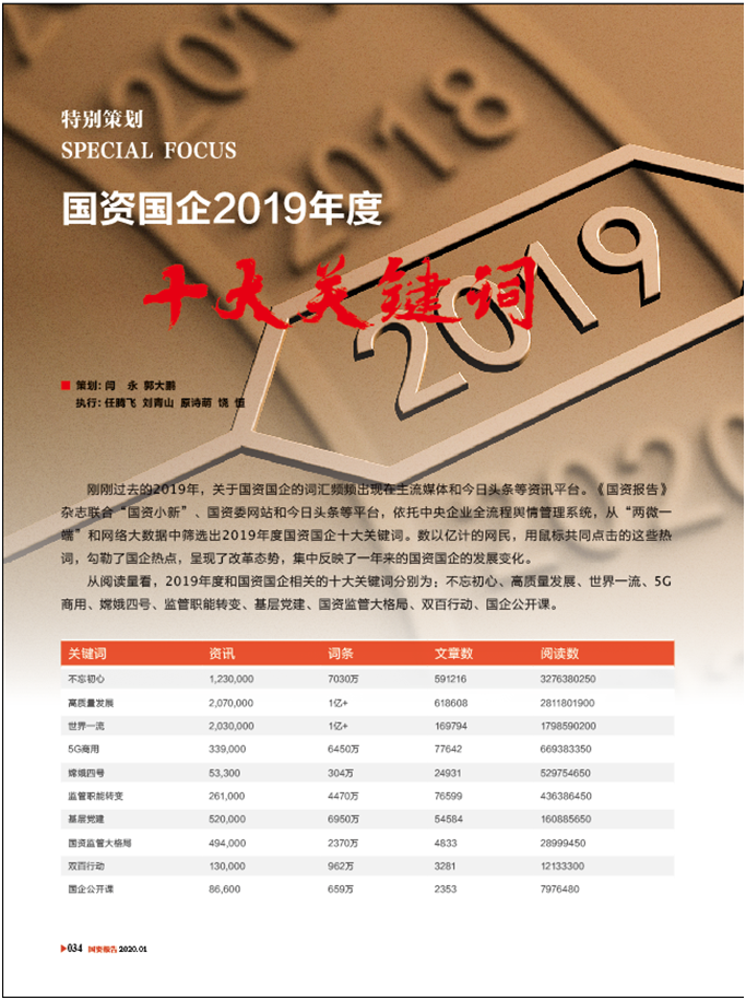 剛(gang)剛(gang)過去(qu)的(de)2019年,關于國(guo)(guo)資(zi)(zi)(zi)國(guo)(guo)企(qi)的(de)詞(ci)(ci)匯頻頻出現(xian)(xian)在主流(liu)媒體和今日頭條等(deng)資(zi)(zi)(zi)訊平(ping)臺(tai)。《國(guo)(guo)資(zi)(zi)(zi)報告》雜(za)志聯合“國(guo)(guo)資(zi)(zi)(zi)小(xiao)新”、國(guo)(guo)資(zi)(zi)(zi)委(wei)網站和今日頭條等(deng)平(ping)臺(tai),依托(tuo)中(zhong)央(yang)企(qi)業全(quan)流(liu)程(cheng)輿情管理系統,從“兩微一端”和網絡大數據中(zhong)篩(shai)選出2019年度國(guo)(guo)資(zi)(zi)(zi)國(guo)(guo)企(qi)十大關鍵詞(ci)(ci)。數以億(yi)計的(de)網民,用鼠(shu)標共同點(dian)擊的(de)這些(xie)熱(re)詞(ci)(ci),勾勒(le)了(le)國(guo)(guo)企(qi)熱(re)點(dian),呈(cheng)現(xian)(xian)了(le)改革態勢,集中(zhong)反映了(le)一年來的(de)國(guo)(guo)資(zi)(zi)(zi)國(guo)(guo)企(qi)的(de)發展(zhan)變(bian)化。