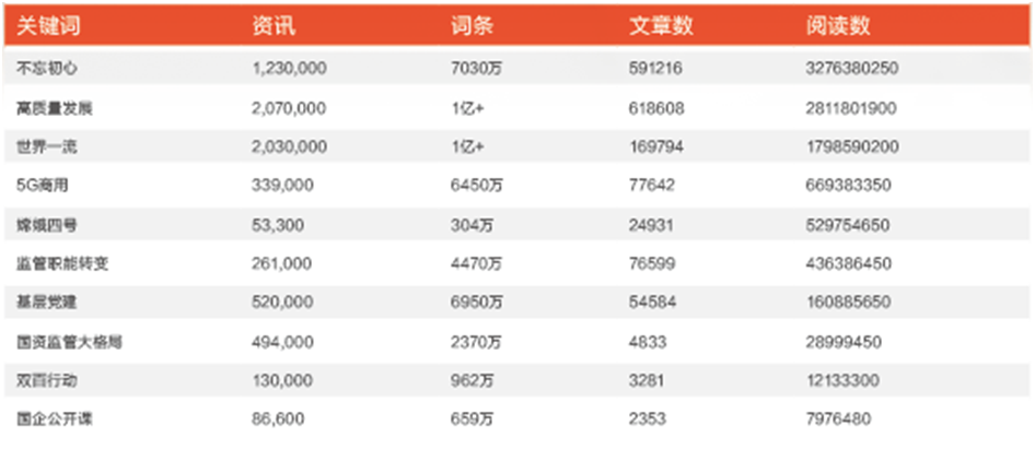 從閱讀量(liang)看,2019年度和國(guo)資國(guo)企(qi)相關(guan)的十大(da)關(guan)鍵詞分別為(wei):不忘初心、高質量(liang)發展、世界一流、5G商用、嫦娥四(si)號、監(jian)管職(zhi)能轉變(bian)、基層黨建、國(guo)資監(jian)管大(da)格局、雙百行(xing)動、國(guo)企(qi)公開課。
