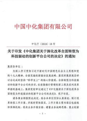 2018年(nian)4月,中(zhong)化(hua)集團通過了(le)深化(hua)改(gai)革全面轉型(xing)工作方案并發布相關決定,從政策支持(chi)、創(chuang)新戰略、評價體(ti)系、總部改(gai)革等八個(ge)方面提出36項重(zhong)點任務,繪制了(le)深化(hua)改(gai)革的“施工圖”,立下了(le)全面轉型(xing)為(wei)科技驅動創(chuang)新型(xing)企(qi)業的“軍(jun)令狀”。