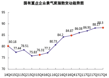 景氣指數逐季走高。據測算,2017年分季度國有重點企業景氣度指數依次為86.08%、86.91%、88.17%和88.3%,年內景氣度指數呈現逐季攀升走勢。如果從近三年景氣度指數變動趨勢圖看,景氣度指數已連續九個季度保持上升,比近年來的最低點(2015年三季度75.83%)累計上升12.47個百分點。