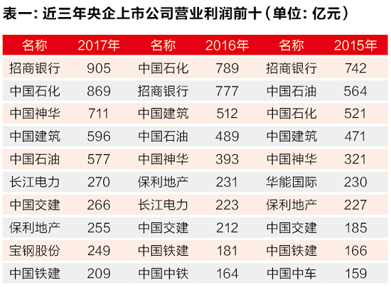 進一(yi)步觀察發現,2015年到2017年,央企(qi)上市公司利潤前(qian)十名中(見表(biao)一(yi)),招(zhao)商銀行、中國(guo)石化、中國(guo)石油、中國(guo)神華、中國(guo)建(jian)筑、保利地產、中國(guo)交(jiao)建(jian)和中國(guo)鐵(tie)建(jian)等8家每年都榜上有名,表(biao)現可(ke)以說較為穩定。