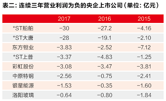 統計發現(xian),有8家央企上市公司連續三年的營業利(li)潤(run)為負(見表二)。