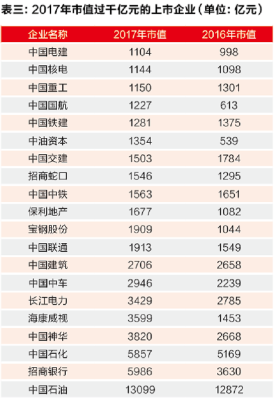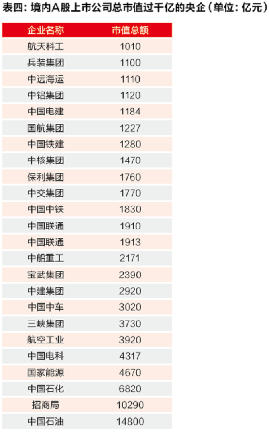 市(shi)值(zhi)過千億元的(de)央(yang)企(qi)上(shang)市(shi)公司有20家(jia)(見表三)。其中,中國石油和(he)(he)中油資(zi)本(ben)兩(liang)家(jia)上(shang)市(shi)企(qi)業同(tong)屬(shu)(shu)中石油,招商銀(yin)行、招商蛇口(kou)兩(liang)家(jia)同(tong)屬(shu)(shu)招商局。這20家(jia)上(shang)市(shi)公司市(shi)值(zhi)總(zong)(zong)和(he)(he)為超過5.8萬(wan)億元,占(zhan)(zhan)央(yang)企(qi)A股(gu)上(shang)市(shi)公司市(shi)值(zhi)總(zong)(zong)額的(de)一半左右,占(zhan)(zhan)A股(gu)市(shi)值(zhi)的(de)十分之一以(yi)上(shang)。