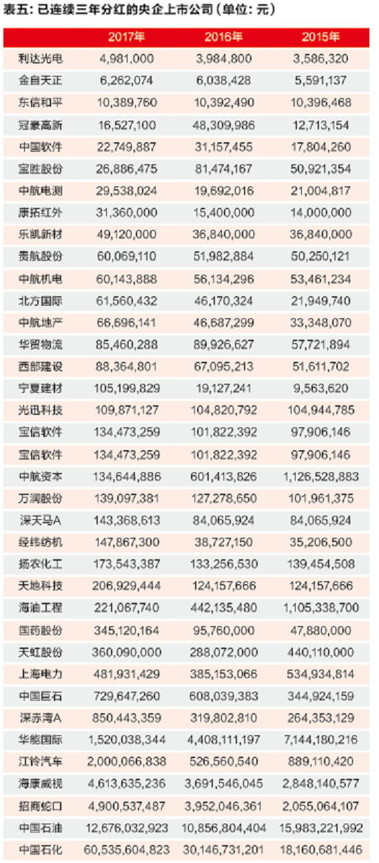 截至2018年(nian)5月(yue)30日,已(yi)(yi)連續三年(nian)分紅(hong)(hong)的央企(qi)(qi)(qi)上市企(qi)(qi)(qi)業為36家(見表五)。2017年(nian),中(zhong)(zhong)國石油、中(zhong)(zhong)國石化(hua)位居已(yi)(yi)分紅(hong)(hong)A股企(qi)(qi)(qi)業第一、第二。其中(zhong)(zhong)中(zhong)(zhong)國石化(hua)累計(ji)三年(nian)分紅(hong)(hong)1088億(yi)元(yuan),中(zhong)(zhong)國石油累計(ji)分紅(hong)(hong)395億(yi)元(yuan)。