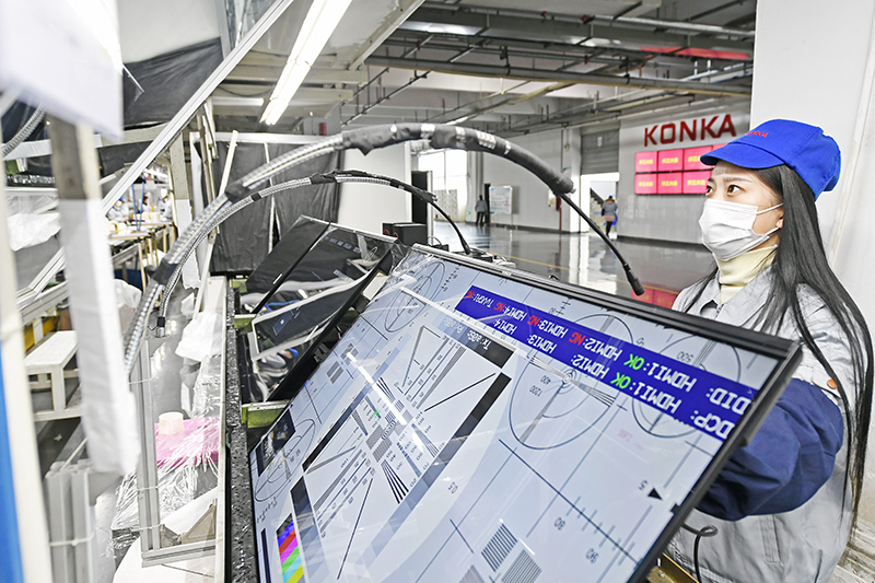 安徽康佳彩電生產線人員在對彩電進行調試
