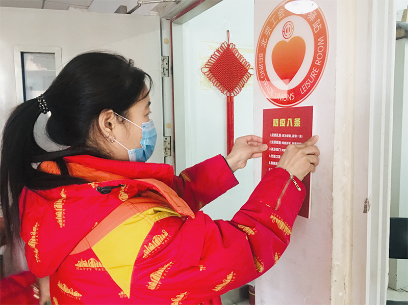 華僑城集團旗下歡樂谷旅游景區員工正在辦公區張貼疫情防控宣傳標語