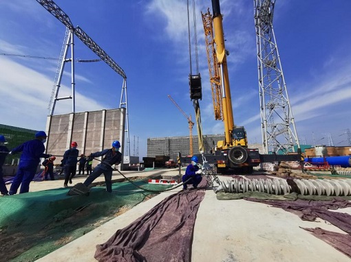 國網河南電力施工人員在駐馬店換流變電站施工現場開展跨線安裝作業