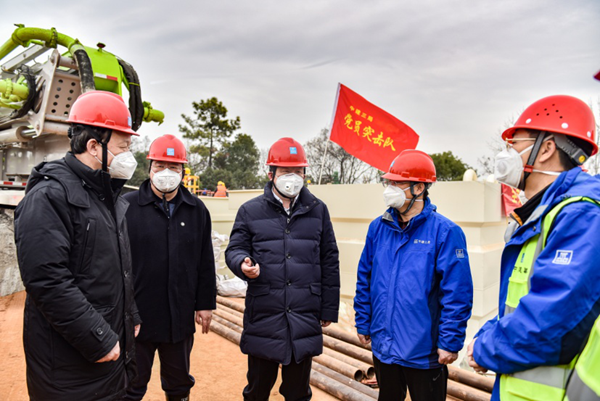 中建集團黨組書記、董事長周乃翔,黨組副書記、總經理鄭學選調研火神山、雷神山醫院工地現場。