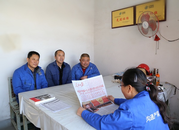 中國鐵物鷹防公司生產支部黨員休息間隙看報學習十九大精神