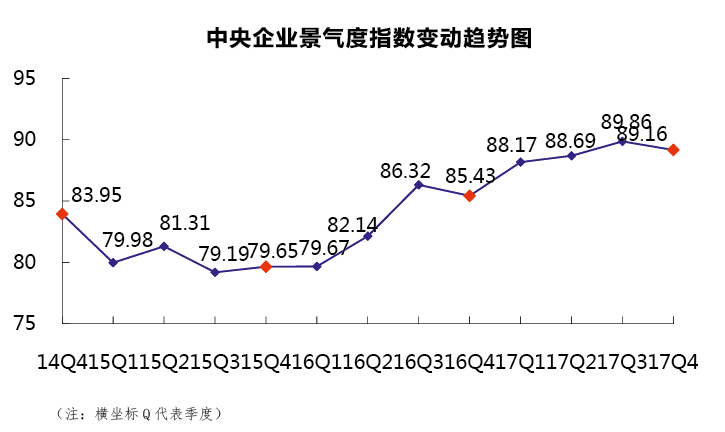 2017年中央(yang)企業景氣(qi)度(du)指(zhi)數分季(ji)度(du)依次為88.17%、88.69%、89.86%和89.16%,實現高位平穩運行。