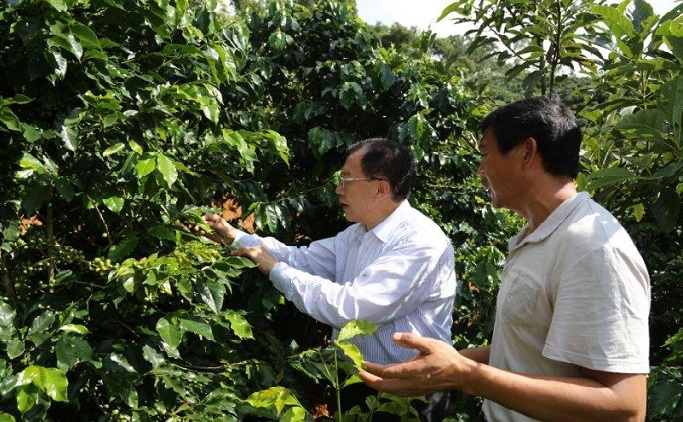 十(shi)九大代表、全國(guo)政協委員(yuan)、中國(guo)旅(lv)游集團(tuan)公司董(dong)事長張學武(左一)在云南(nan)省孟連(lian)縣芒掌咖啡(fei)種植園調研。
