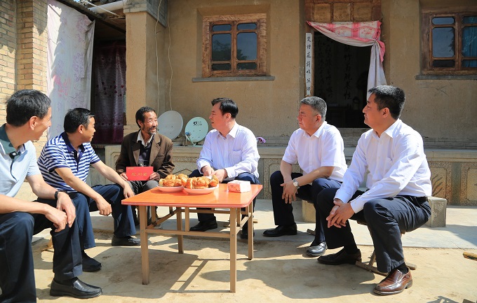 中國(guo)中車(che)集團公司董事長(chang)、黨委書記劉化龍(long)(右三)在(zai)甘(gan)肅省甘(gan)谷(gu)縣走訪建檔(dang)立卡戶