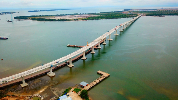 文(wen)萊大(da)摩(mo)(mo)拉(la)島(dao)(dao)大(da)橋(qiao)(qiao)(qiao)項目全長(chang)5915米(mi),為(wei)(wei)雙向四車道公路,主(zhu)要(yao)(yao)包括一座(zuo)長(chang)2680米(mi)的跨(kua)海(hai)大(da)橋(qiao)(qiao)(qiao),其(qi)主(zhu)橋(qiao)(qiao)(qiao)為(wei)(wei)連續剛構(gou),引橋(qiao)(qiao)(qiao)為(wei)(wei)節段預(yu)制拼裝。大(da)橋(qiao)(qiao)(qiao)建成后將(jiang)成為(wei)(wei)文(wen)萊首座(zuo)跨(kua)海(hai)特(te)大(da)橋(qiao)(qiao)(qiao)梁,大(da)摩(mo)(mo)拉(la)島(dao)(dao)將(jiang)告別無橋(qiao)(qiao)(qiao)梁連接文(wen)萊大(da)陸(lu)的歷(li)史,這對推(tui)進文(wen)萊城市發(fa)展、開發(fa)大(da)摩(mo)(mo)拉(la)島(dao)(dao)石油和(he)天然氣資源具(ju)有(you)重要(yao)(yao)意義。