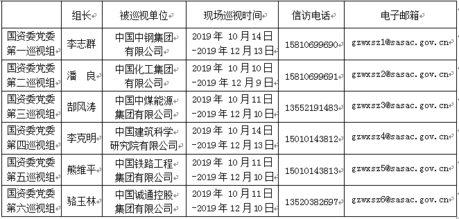 根據黨中(zhong)央關于巡(xun)視(shi)工作(zuo)的決策部署,按照(zhao)國資(zi)委(wei)黨委(wei)工作(zuo)安排,10月中(zhong)旬,國資(zi)委(wei)黨委(wei)巡(xun)視(shi)組進駐中(zhong)國誠通控股集(ji)(ji)(ji)團(tuan)有(you)(you)限(xian)(xian)(xian)公司(si)、中(zhong)國中(zhong)煤能(neng)源集(ji)(ji)(ji)團(tuan)有(you)(you)限(xian)(xian)(xian)公司(si)、中(zhong)國中(zhong)鋼集(ji)(ji)(ji)團(tuan)有(you)(you)限(xian)(xian)(xian)公司(si)、中(zhong)國化(hua)工集(ji)(ji)(ji)團(tuan)有(you)(you)限(xian)(xian)(xian)公司(si)、中(zhong)國建筑科學研究院有(you)(you)限(xian)(xian)(xian)公司(si)、中(zhong)國鐵(tie)路工程集(ji)(ji)(ji)團(tuan)有(you)(you)限(xian)(xian)(xian)公司(si)等6家中(zhong)央企業開展常(chang)規巡(xun)視(shi)。