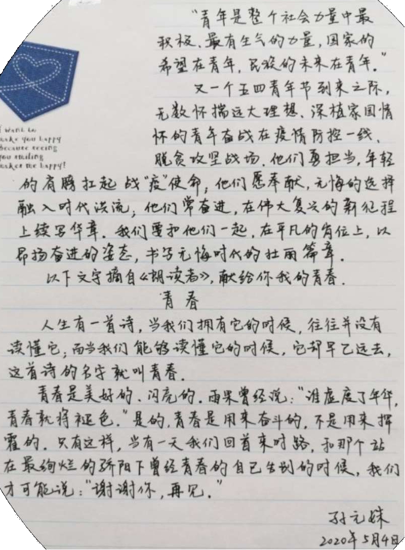 今年五四(si)期(qi)間(jian),國資委(wei)機械(xie)離退局團支部(bu)開展了“綻放(fang)戰(zhan)疫(yi)青(qing)春·堅定制度自信”主題筆談活(huo)動,組織全局40歲以下青(qing)年同(tong)(tong)志參(can)加,通過親(qin)筆書(shu)寫心得體會,交流青(qing)年同(tong)(tong)志在參(can)與疫(yi)情防控期(qi)間(jian)的(de)所(suo)感所(suo)思,并以硬(ying)筆書(shu)法展評的(de)形式,將青(qing)年同(tong)(tong)志的(de)戰(zhan)疫(yi)體會向全局同(tong)(tong)志展示。