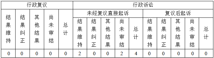 因(yin)信(xin)息公開(kai)被申請行(xing)(xing)政復(fu)議0件、提起行(xing)(xing)政訴訟4件。提起的(de)行(xing)(xing)政訴訟,均為未經復(fu)議直接起訴件,其中結果(guo)維持2件,尚未審結2件。