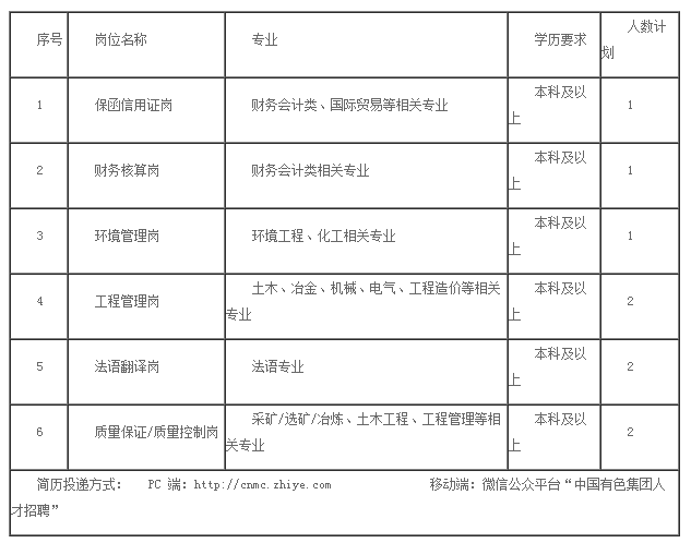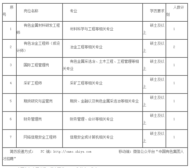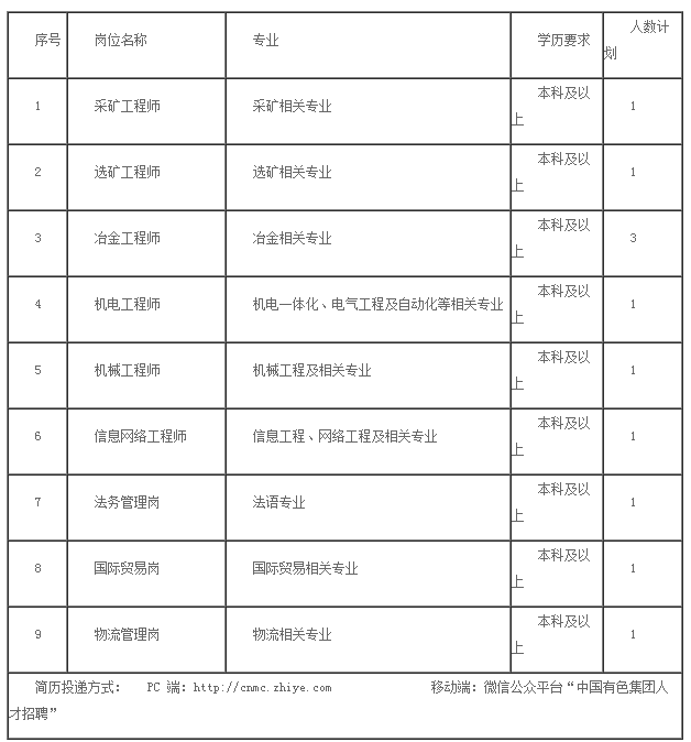 中國有色集團“掘金者”項目、中國有色金屬建設股份有限公司、中色礦業香港控股有限公司、中色國際貿易有限公司、贊比亞中國經濟貿易合作區發展有限公司、鑫誠建設監理咨詢有限公司、中色盧安夏銅業有限公司崗位簡歷投遞方式如下