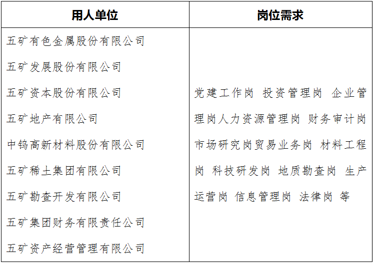 (更多職(zhi)位(wei)信(xin)息見企(qi)業招聘(pin)官方(fang)網站:zhaopin.minmetals.com.cn)